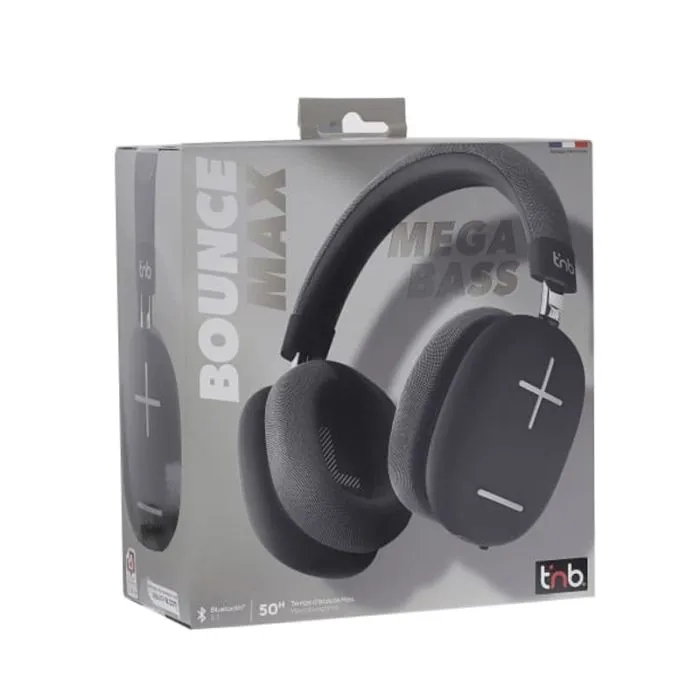 Casque TNB Bounce Max CBBOUNCE2BK Mega Bass - Connectivité Sans Fil: Bluetooth 5.3 - Interfaces: Jack 3.5, USB Type-C - Diamètre de Casque: 40 mm - Distance de fonctionnement: 10 mètres - Gamme de fréquence: 20 Hz à 20 GHz - Batterie lithium-ion 500mAh - Temps de conversation: 50 heures - Arceau réglable - Réduction de bruit passive - Dimensions (LxPxH): 22 x 21 x 8 cm - Couleur: Noir - Garantie: 1an.
