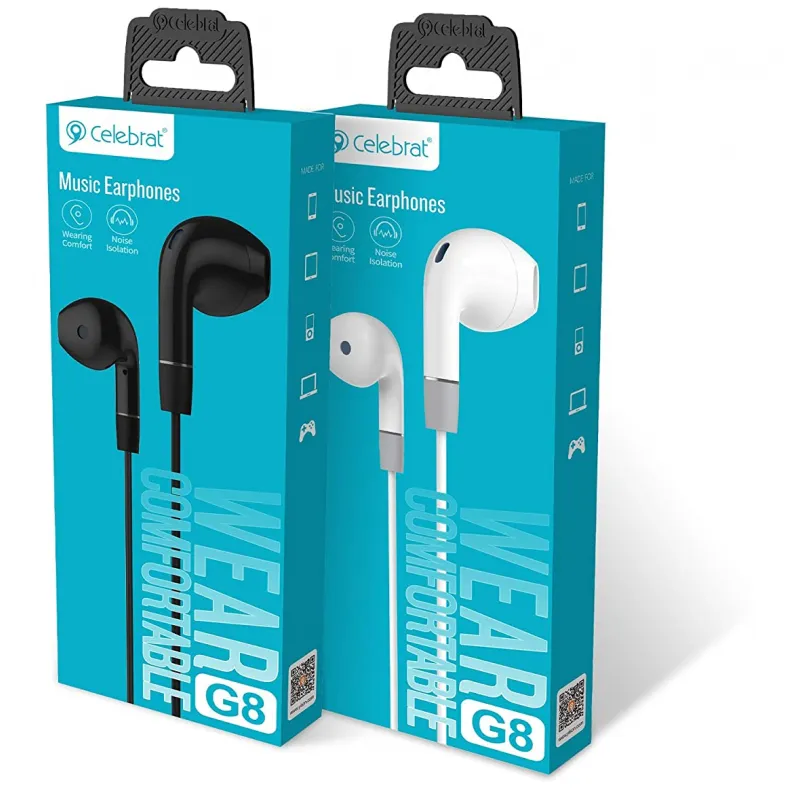 Ecouteur avec Micro Celebrat G8 - Fréquence 20-20Khz - Impédance 32 Ω ±5% - Sensibilité 97dB ± 3dB - Connecteur Jack 3.5mm - Longueur du câble 1.2m - Couleur Blanc