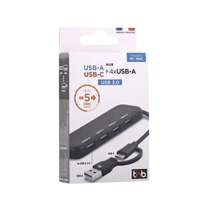Hub TNB - Interface: USB-A + USB-C - Nombre de ports USB: 4 Ports USB 3.0 - Taux de Transfert de données: jusqu'à 5 Gbps 10 fois plus rapide que le USB 2.0 - Design Ultra Slim - Couleur: Noir - Garantie: 1 an.