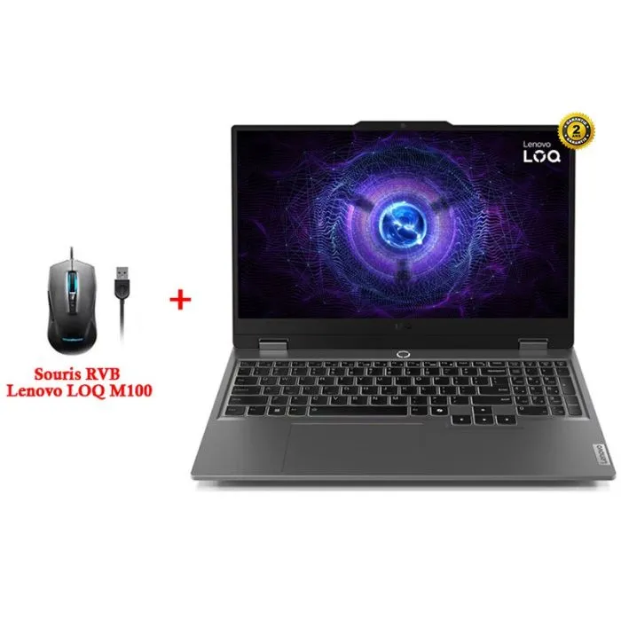 Écran 15.6" Full HD IPS, 144Hz - Processeur: Intel Core i7-13650HX (Up to 4.90 GHz Turbo max , 24Mo de mémoire cache, 14-Cores) - Système d'exploitation: FreeDos - Mémoire RAM: 16Go DDR5-4800 - Disque Dur: 512Go SSD - Carte Graphique: NVIDIA GeForce RTX 3050 (6Go de mémoire dédiée GDDR6) avec Wi-Fi, Bluetooth, 3x USB-A 3.2 Gen 1, 1x USB-C 3.2 Gen 2 avec DisplayPort, 1x HDMI 2.1, 1x RJ-45, 1x prise combo casque/microphone (3,5 mm), 1x connecteur d'alimentation - Clavier Rétroéclairé blanc - Couleur: Luna Gris - Garantie: 2 ans + Souris RVB Lenovo LOQ M100