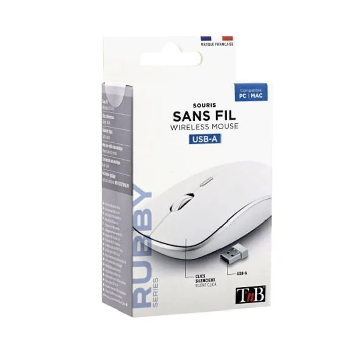 Souris TNB silent click RUBBY - Technologie de Connectivité: Sans Fil (USB-A) - Résolution Optique: 800 - 1200 - 1600dpi - Alimentation: Piles - Avec veille automatique et bouton ON/OFF - Plug&Play, elle se connecte automatiquement une fois le dongle USB branché à l'ordinateur - Design moderne avec une prise en main agréable - Comptabilité: PC/MAC - Couleur: Blanc&Silver - Garantie: 1 an